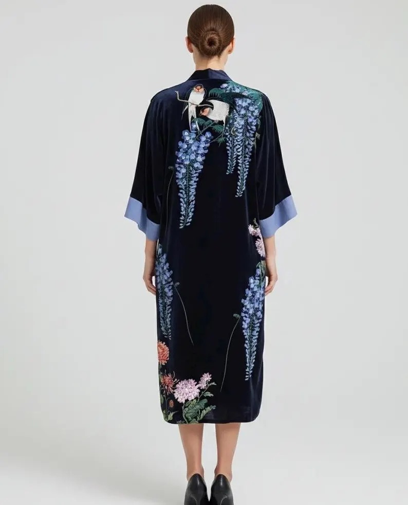 Inspired by Ohara Koson’s iconic “Swallow and Wisteria” woodblock print, this robe blends traditional Japanese elegance with modern wearable art. Intricate wisteria blooms, graceful birds, and chrysanthemum accents cascade across a deep navy velvet drape.