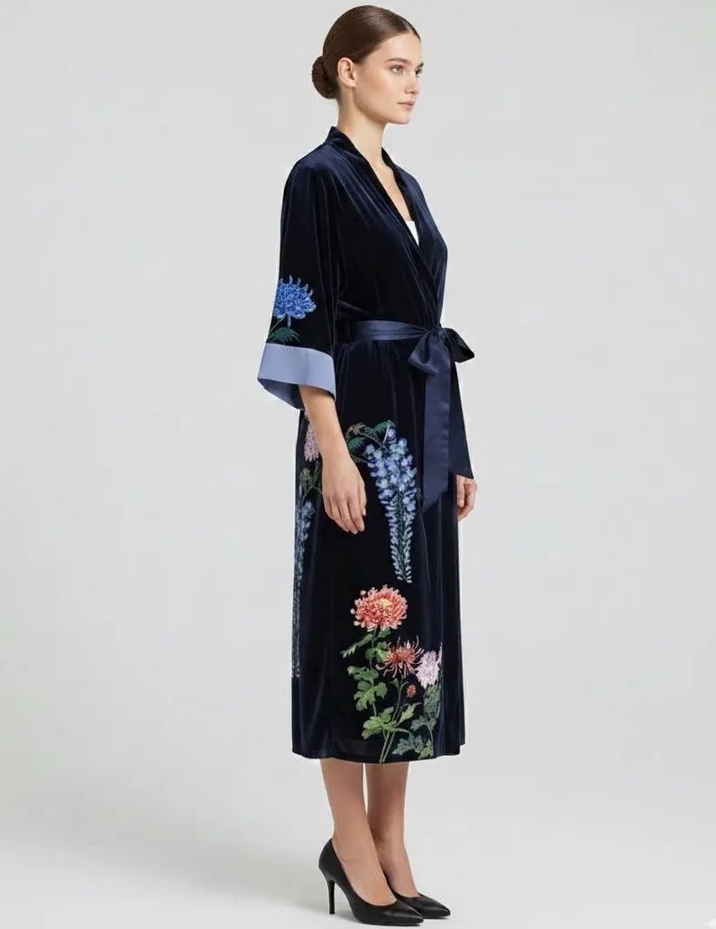 This velvet kimono robe is part of our Journey to the East collection, created as wearable art inspired by classical Japanese woodblock prints.